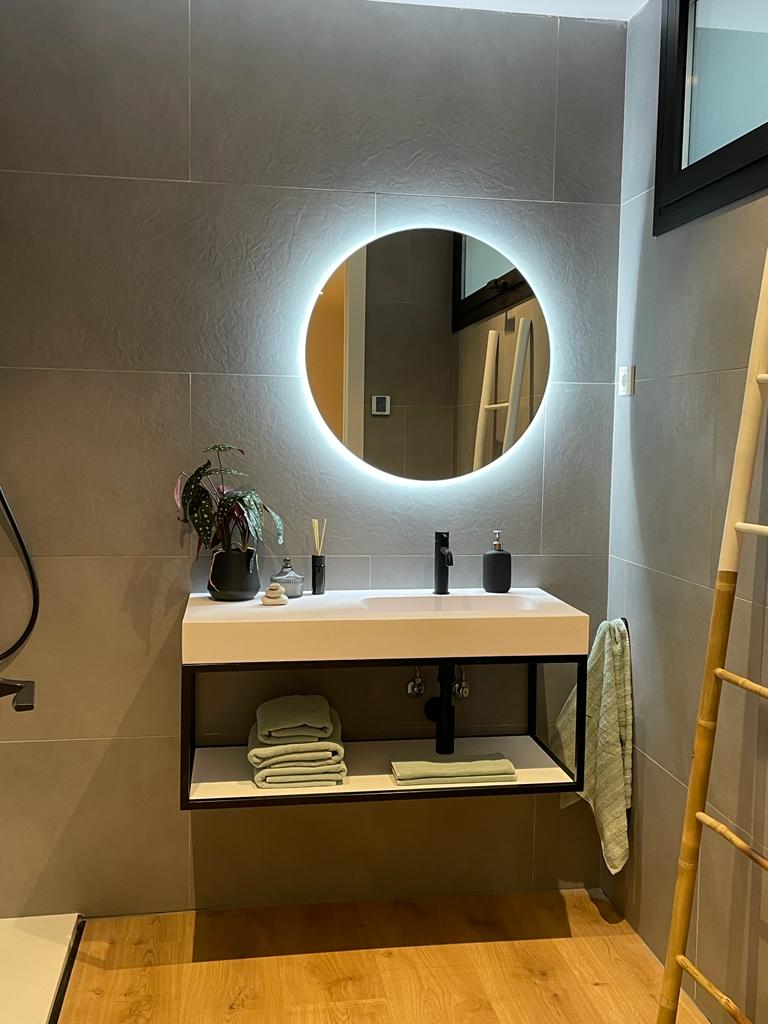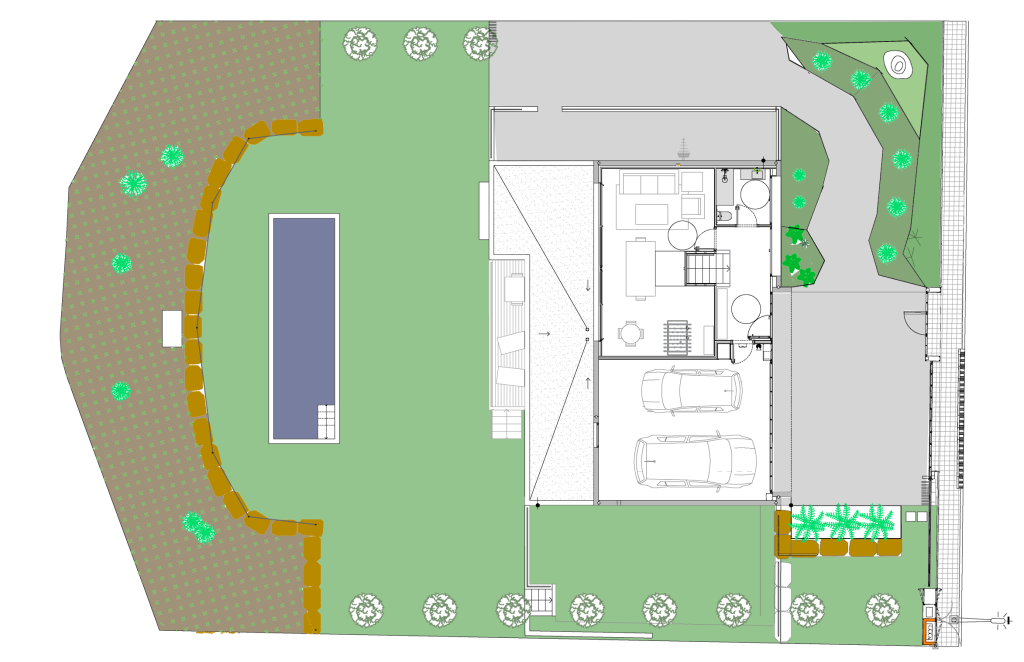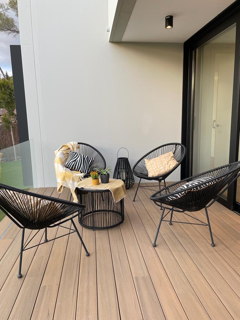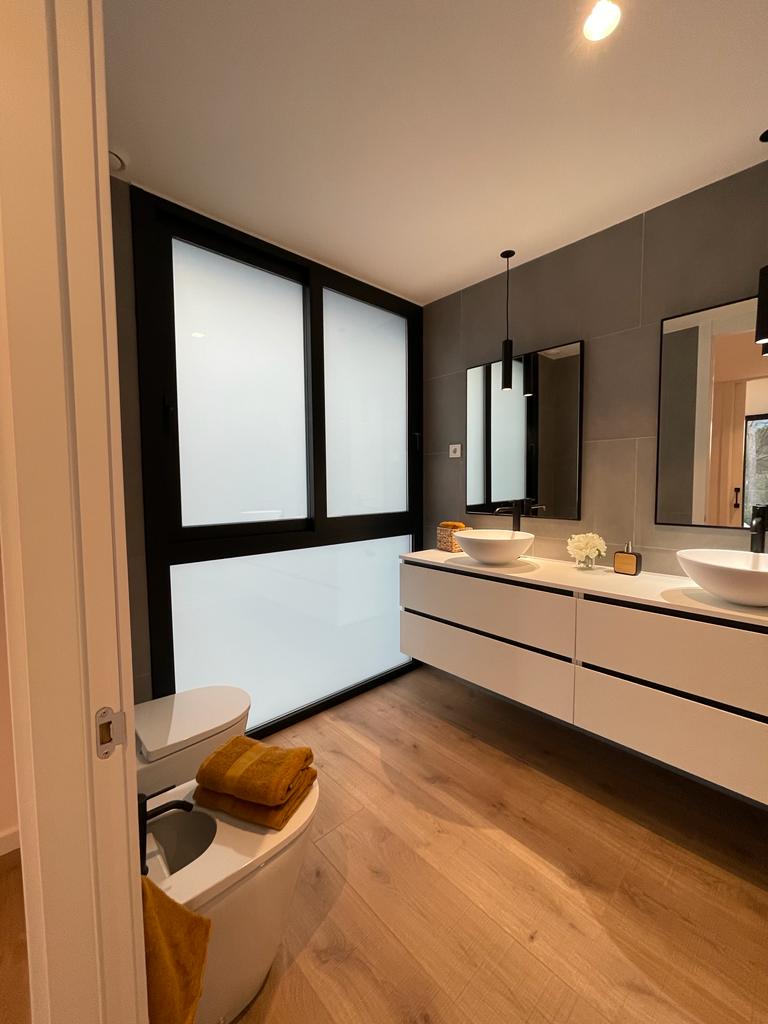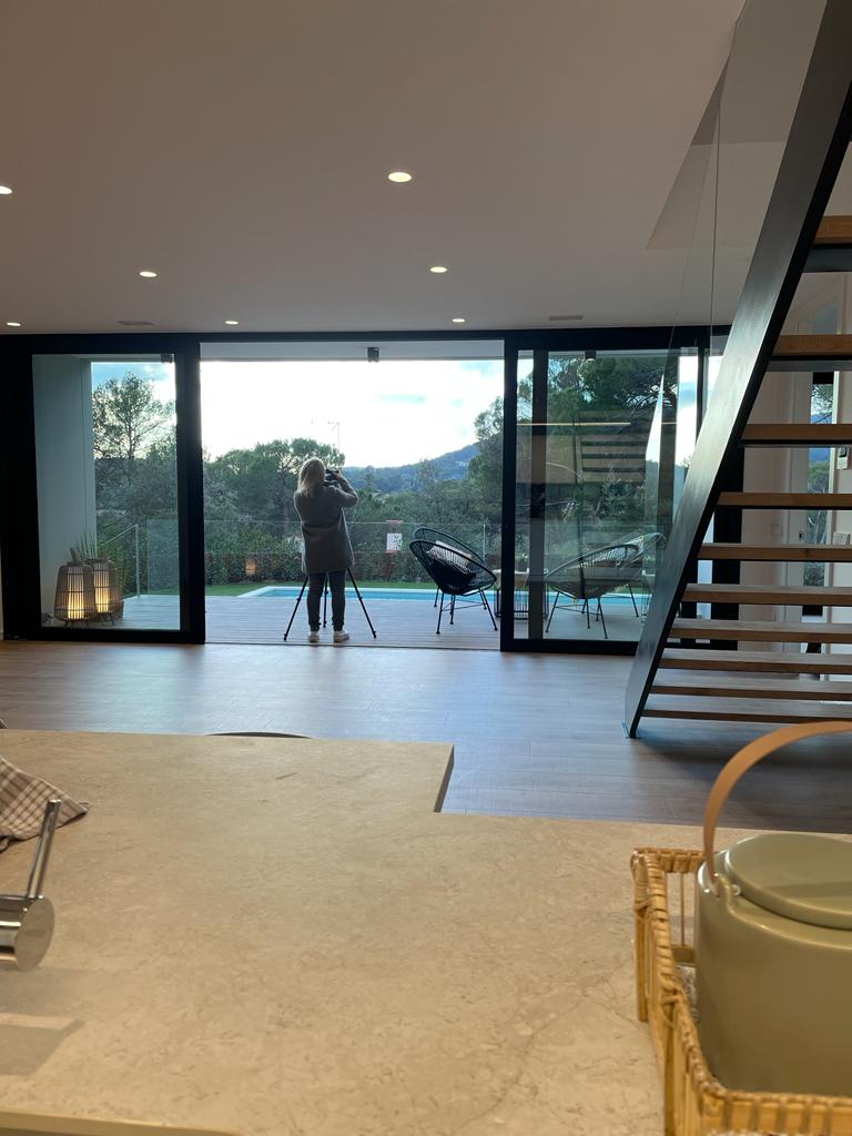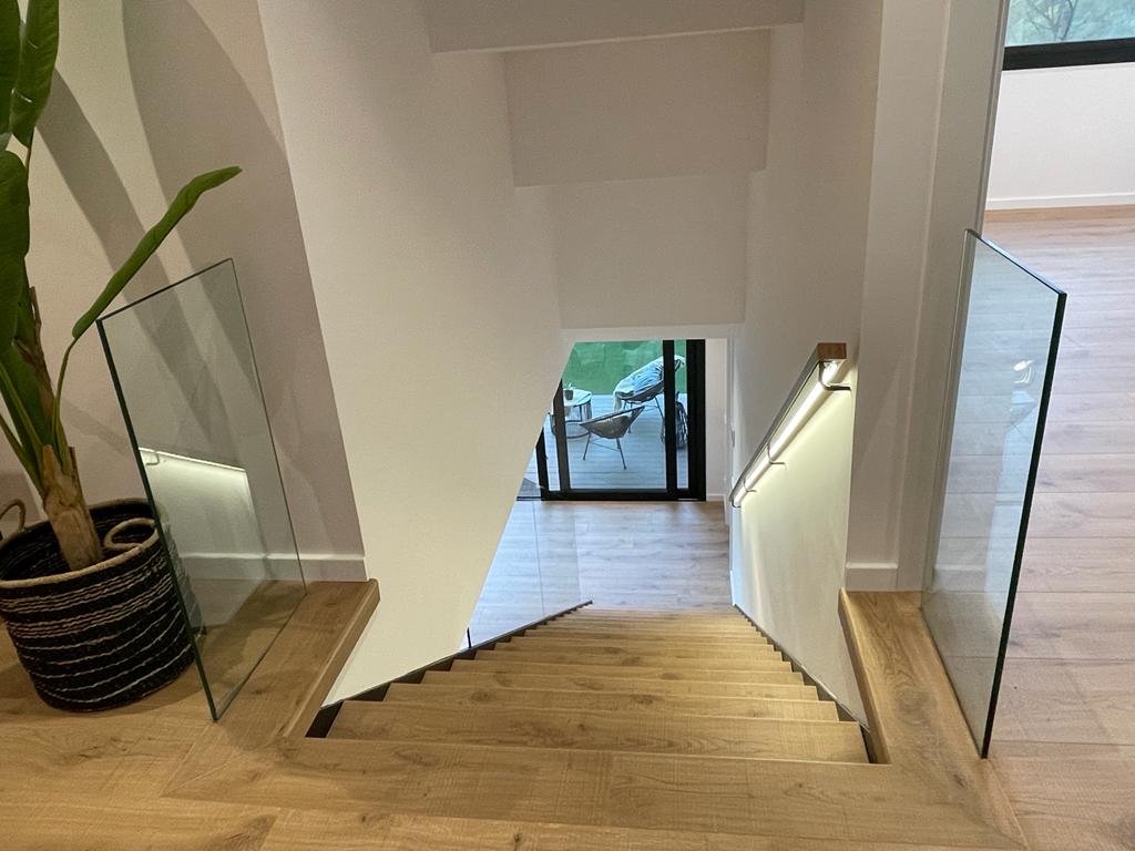 Una escalera central de hormigón une los tres niveles: arriba, el estar-comedor-cocina se abre en la terraza panorámica; en el nivel intermedio, las suites disfrutan de celosías correderas que regulan el sol; y en la planta baja, estudio y zona de invitados conectan directamente con el jardín. La inercia del hormigón, el aislamiento continuo y la ventilación cruzada garantizan eficiencia, mientras pavimentos de roble y luz indirecta añaden calidez.
