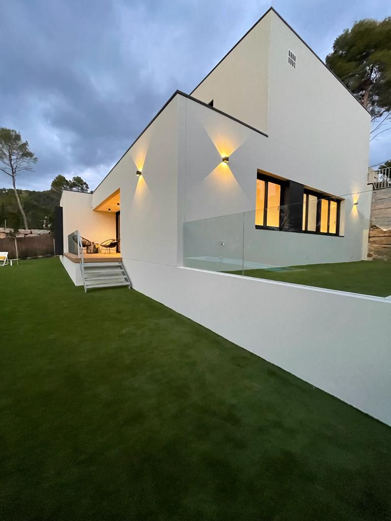 Vivienda unifamiliar de hormigón prefabricado que se adapta a la fuerte pendiente con volúmenes y plataformas escalonadas. Cada terraza recorta la montaña y alberga zonas de jardín, pavimentos de madera y miradores sobre el paisaje, mientras barandillas metálicas ligeras mantienen las vistas limpias. La modulación prefabricada reduce residuos y acelera la obra sin alterar la orografía.