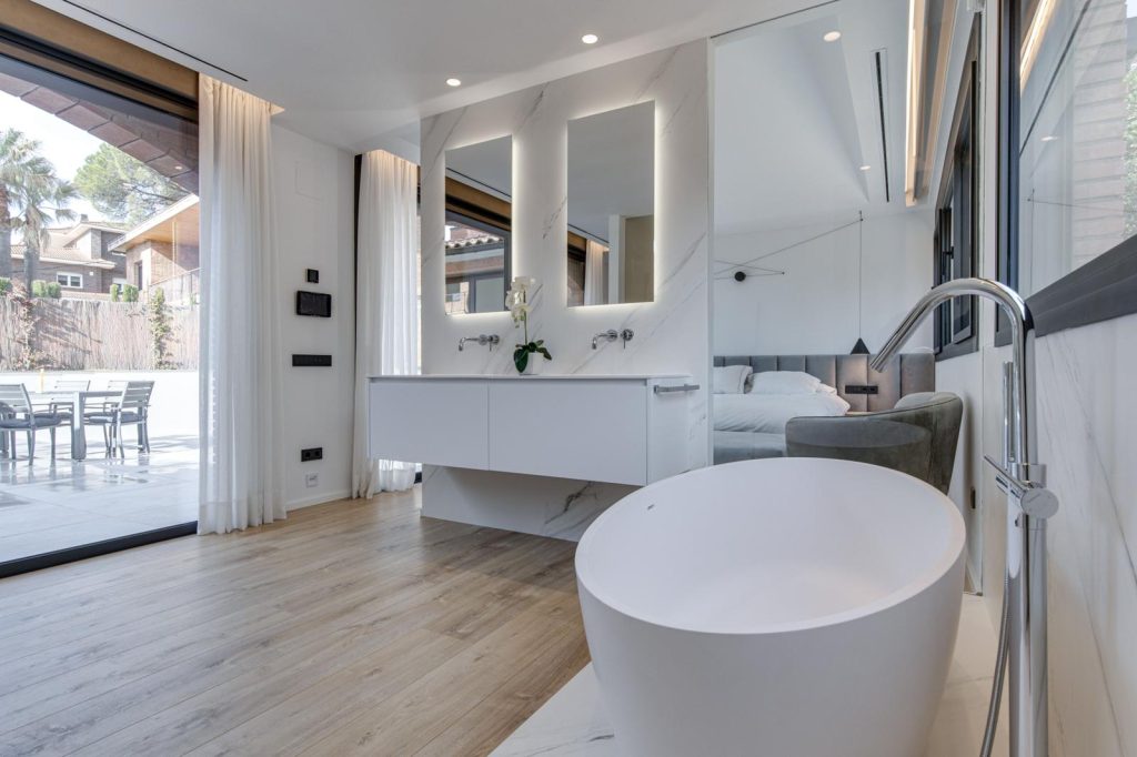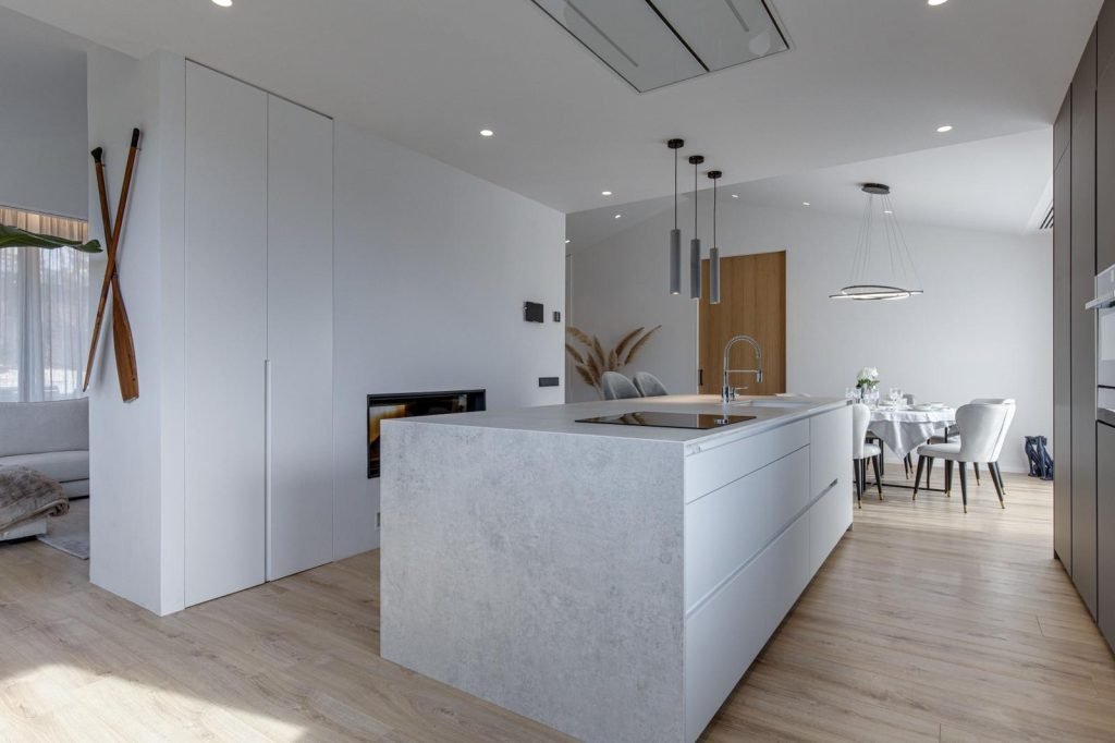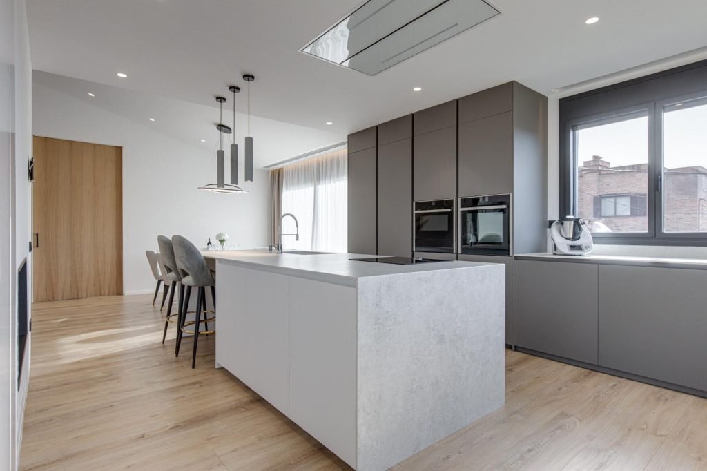 La planta baja se reordena en un espacio fluido salón-comedor-cocina. En el centro, una chimenea de dos caras actúa de núcleo y articulador: flamea hacia el comedor mientras da calor al sofá y define la zona de cocina. El pavimento de madera natural, luz indirecta y detalles minimalistas.