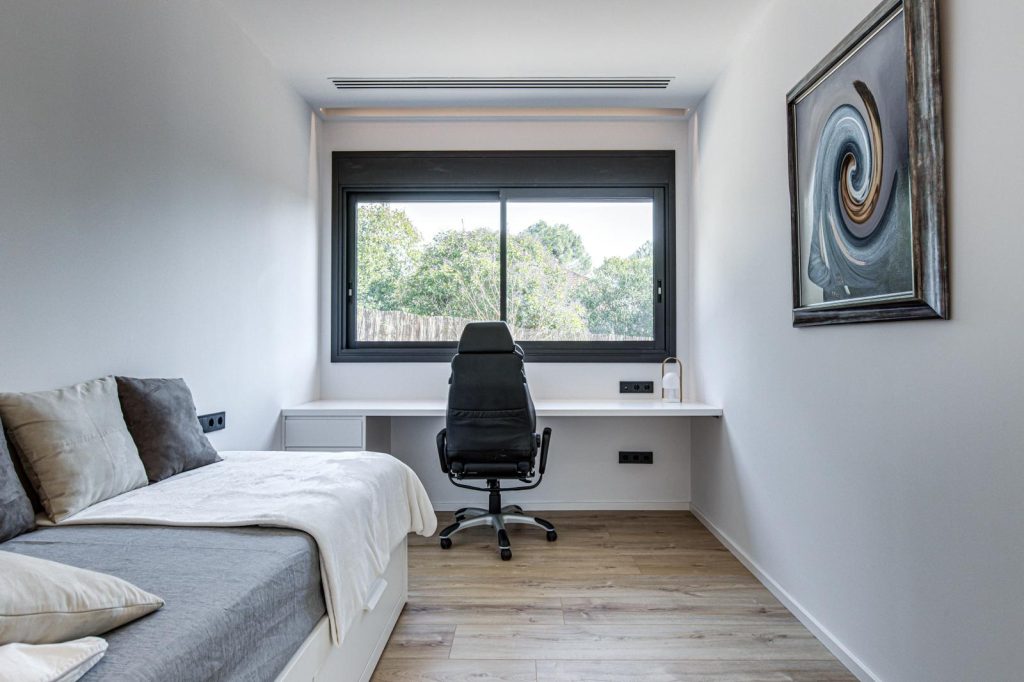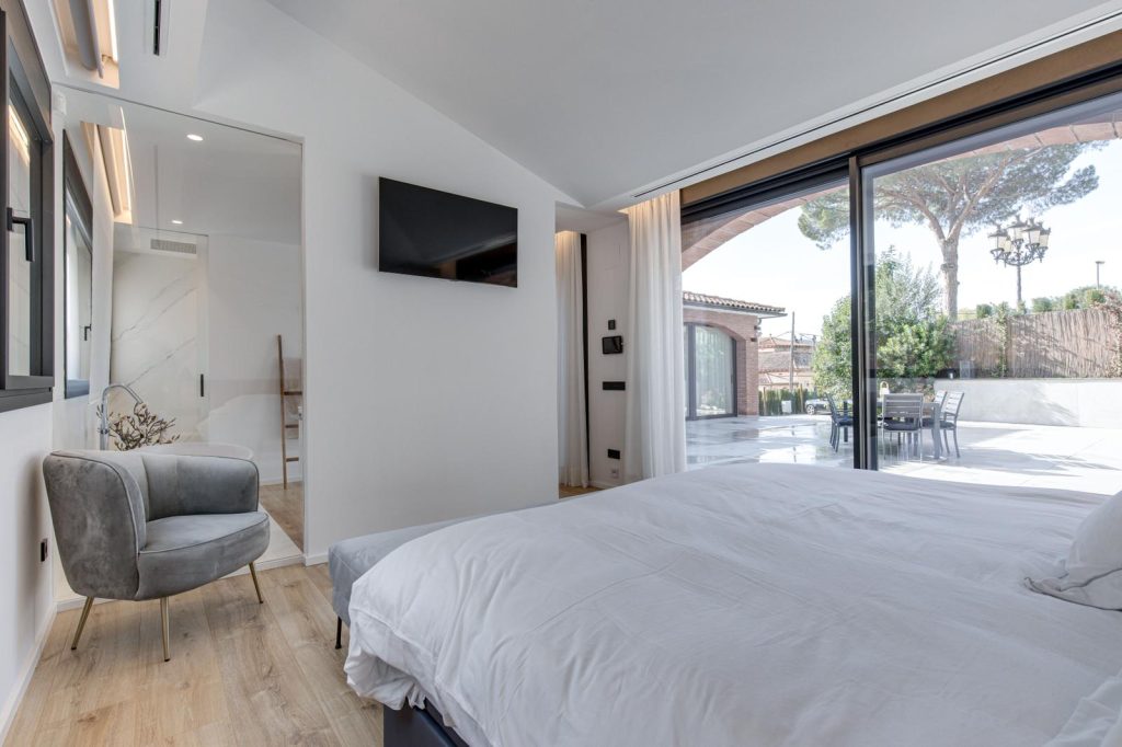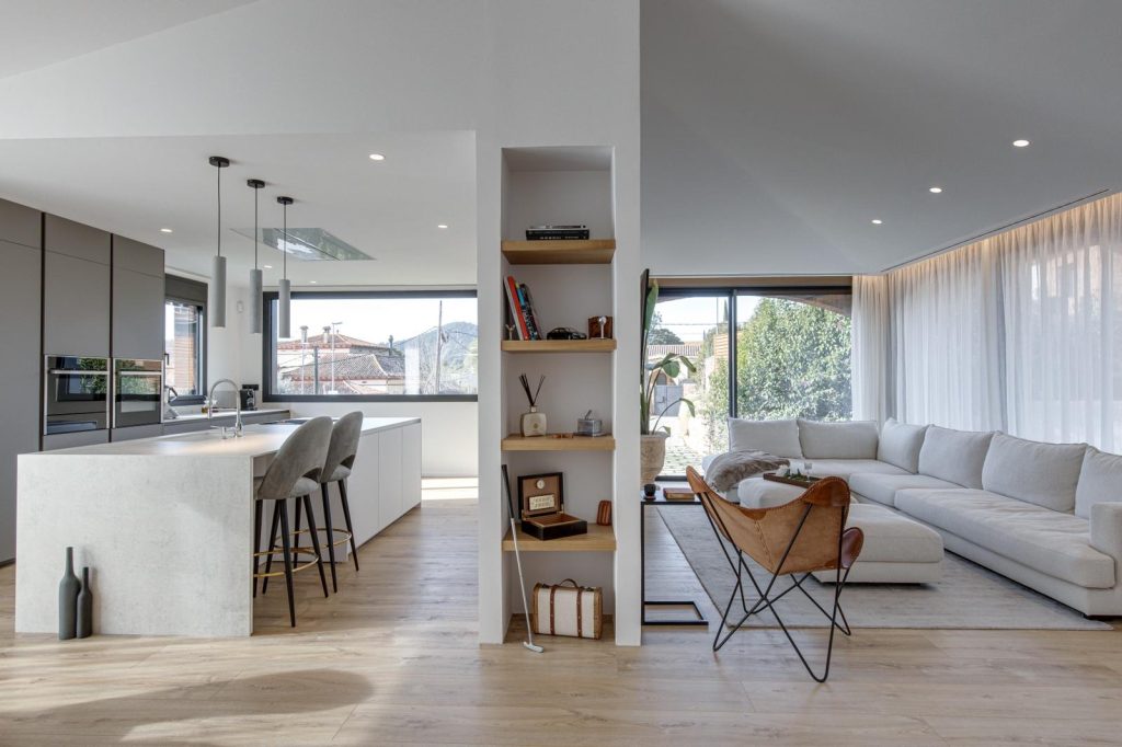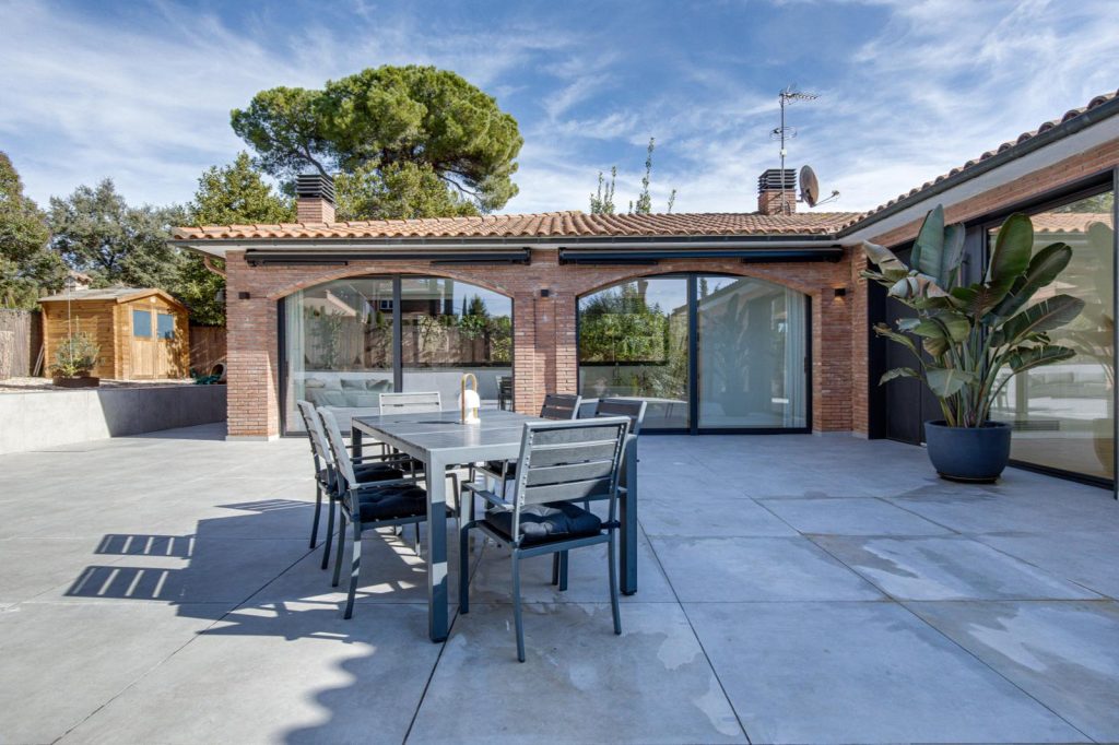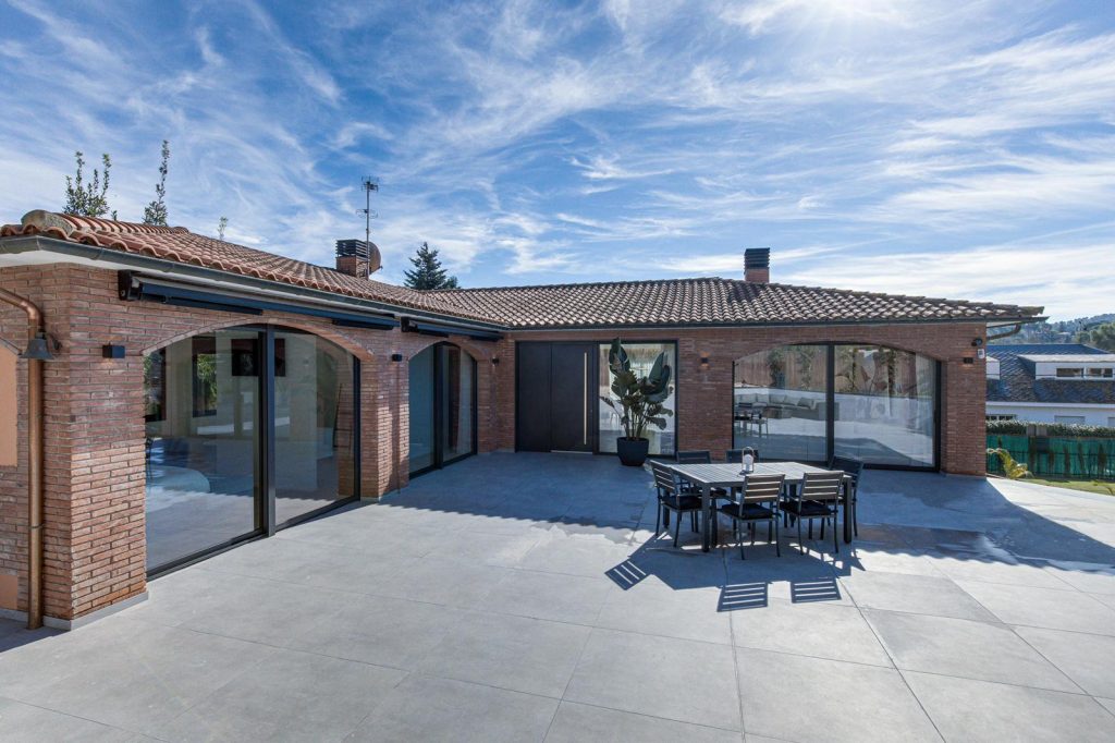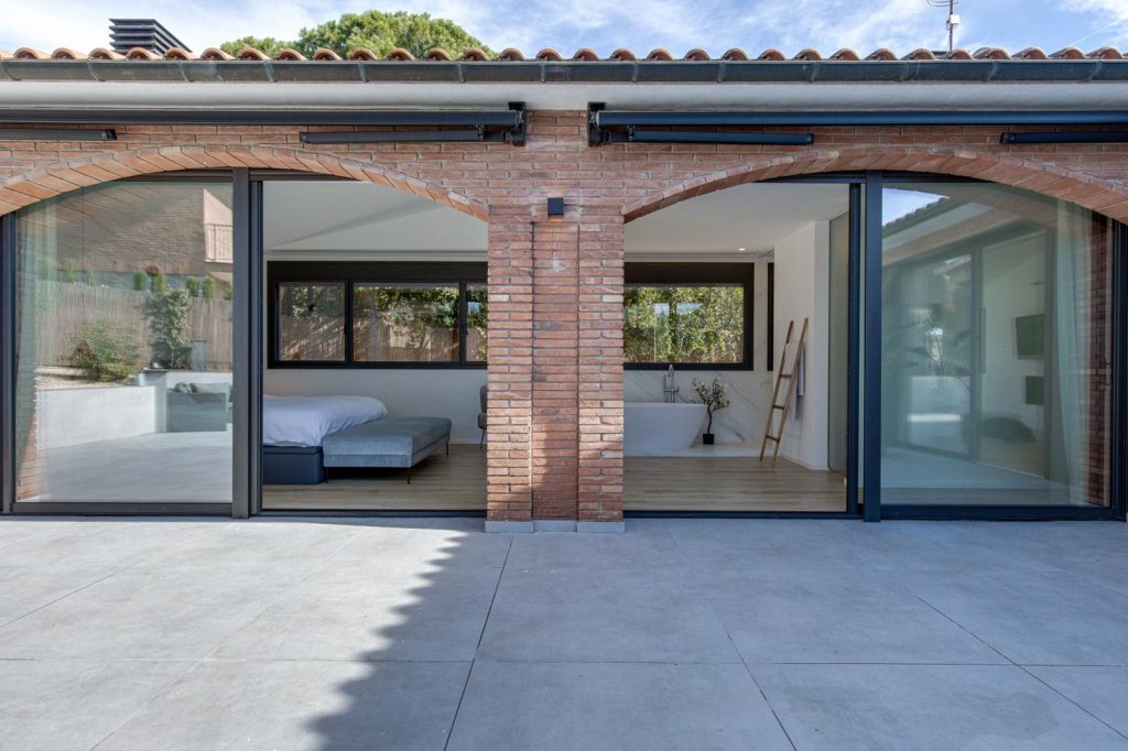 En la fachada, se abren rendijas verticales y ventanales correderos de suelo a techo que conectan visualmente la casa con el paisaje cercano y facilitan la ventilación cruzada. Los nuevos huecos, protegidos con toldos y voladizos ligeros, regulan la luz natural y templan el interior a lo largo del año.