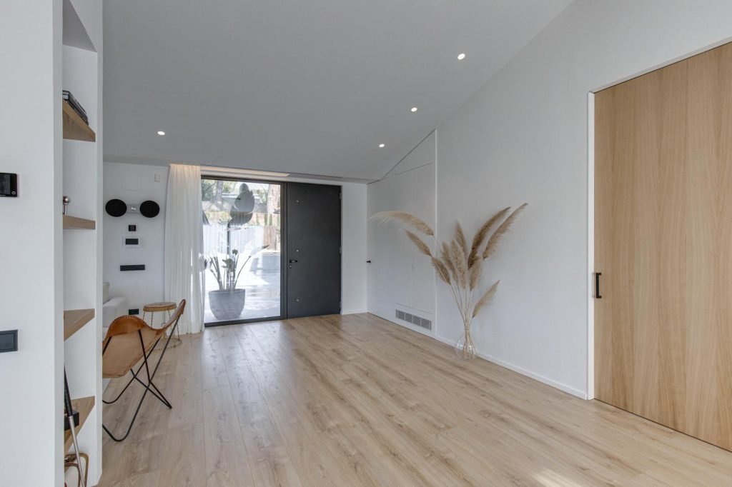 La intervención PN42 parte de una vivienda existente de fábrica de ladrillo visto, respetando su piel original pero dotándola de un nuevo rendimiento térmico. Se añade aislamiento interior, se renuevan las carpinterías con perfiles de aluminio de rotura, para alcanzar una envolvente eficiente y estanca.