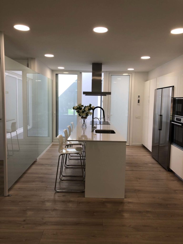 La modulación prefabricada acelera la ejecución, garantiza precisión y minimiza residuos. Paneles con aislamiento integrado y carpinterías de altas prestaciones con vidrio de baja emisividad aseguran muy baja demanda. Aerotermia con suelo radiante-refrescante y doble flujo con recuperación del 90%; domótica para ajustar consignas y monitorizar consumos. Resultado: arquitectura esencial, confort contemporáneo y una conexión íntima y permanente con la naturaleza.