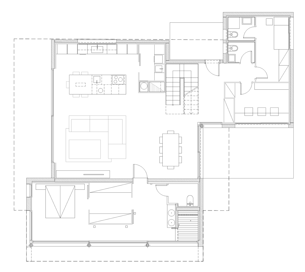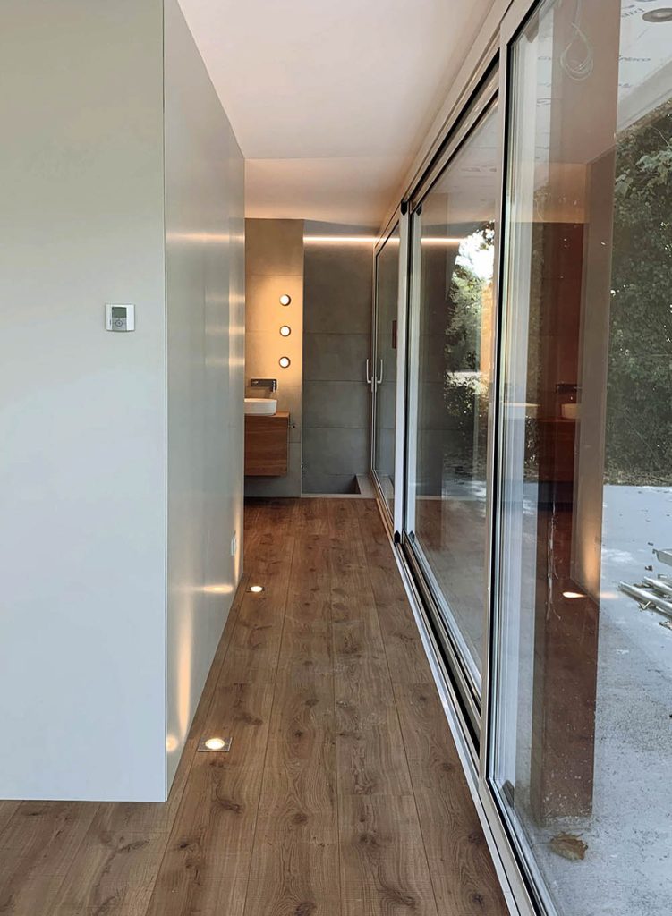 El hormigón visto garantiza robustez e inercia térmica, complementado con aislamiento integrado y cristales de baja emisividad para minimizar la demanda energética. Dentro, pavimentos de madera natural añaden calidez y contrastan con la piel mineral del edificio. El resultado es una vivienda que combina geometría contemporánea, eficiencia y una relación franca con la naturaleza circundante.